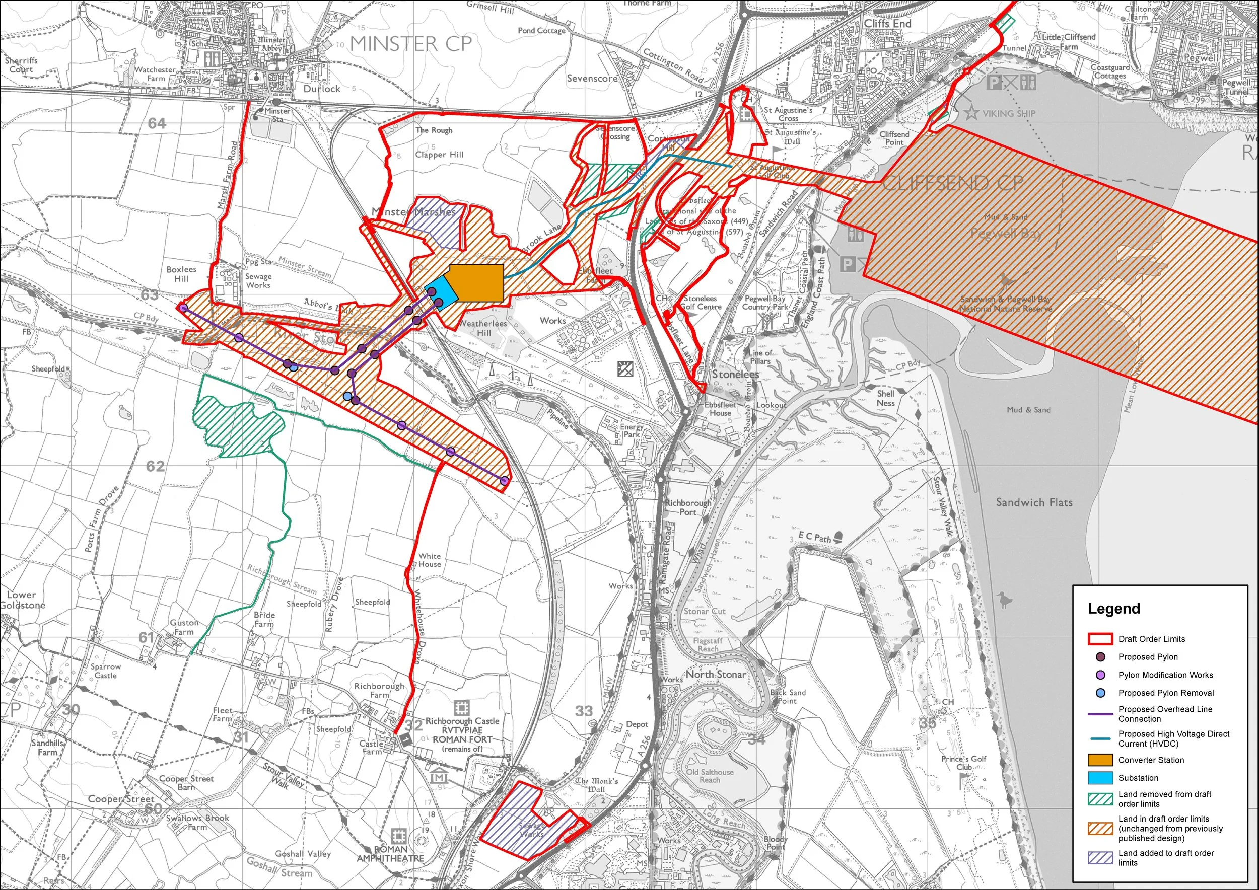 Converter Station and Substation near Minster: A large converter station (up to 28 meters high, covering about 9 hectares) with an adjacent substation are proposed south of Minster, along with approximately 3.5 km of new overhead high-voltage lines connecting to the existing Richborough-to-Canterbury line.